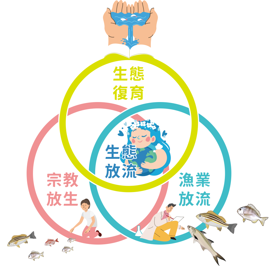 台灣民間素有舉辦魚苗放生活動之風俗,此傳統的放生乃發自慈悲心解救生命遠離死亡,我們相信,「宗教放生」尋求個體生命的「護生」,「科學放流」則尋求生態環境的「互生」,兩者有共同「生態修復」的信念 :讓每條放流出去的物命能夠平安長大、繁衍後代,豐富健全海洋的基因多樣性、物種多樣性及生態系多樣性。